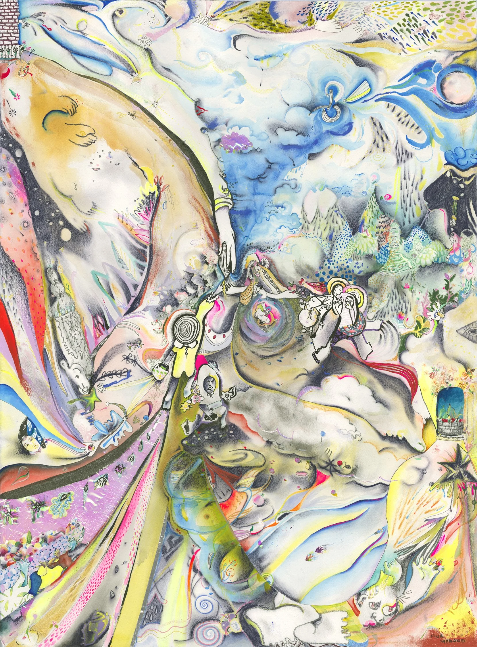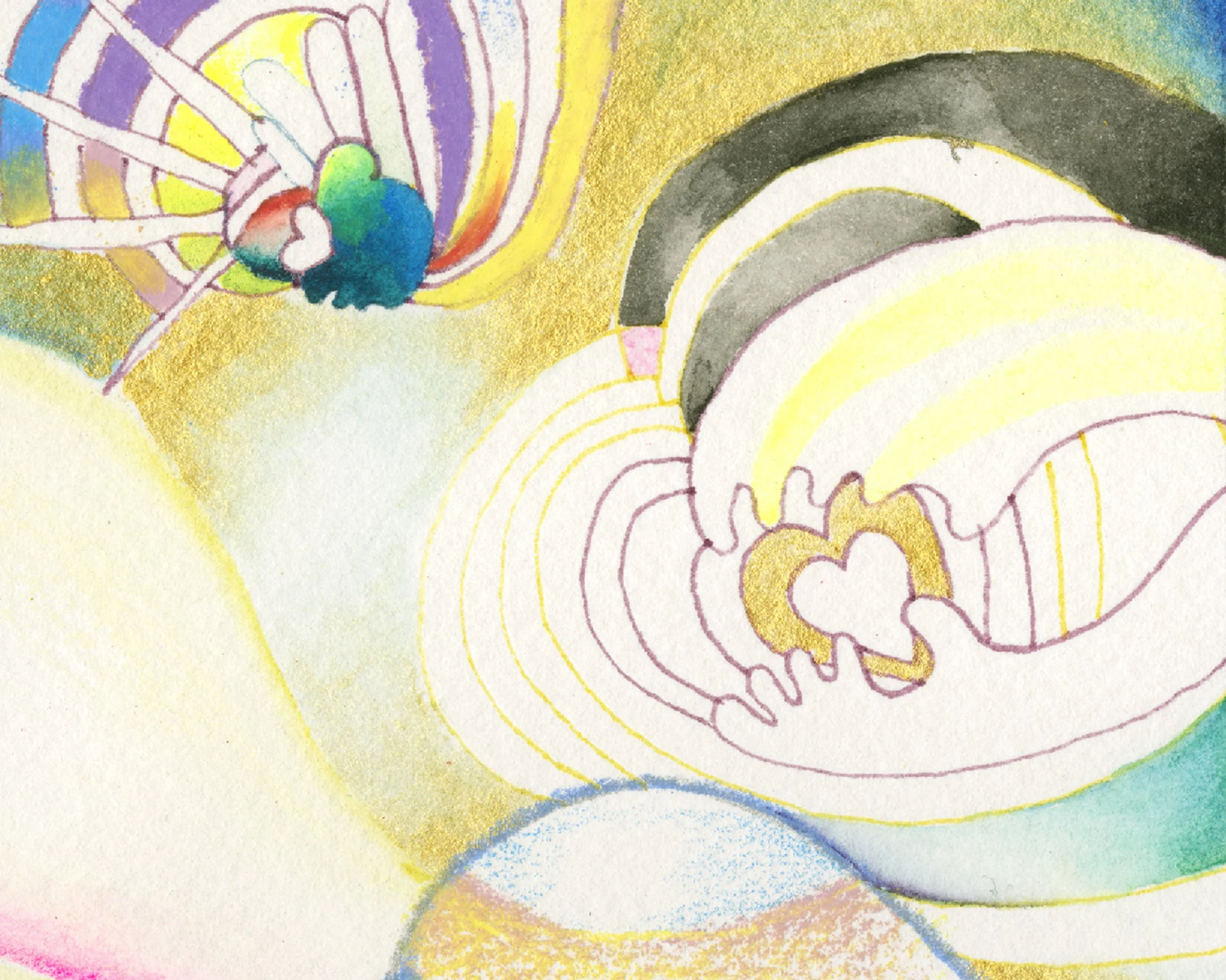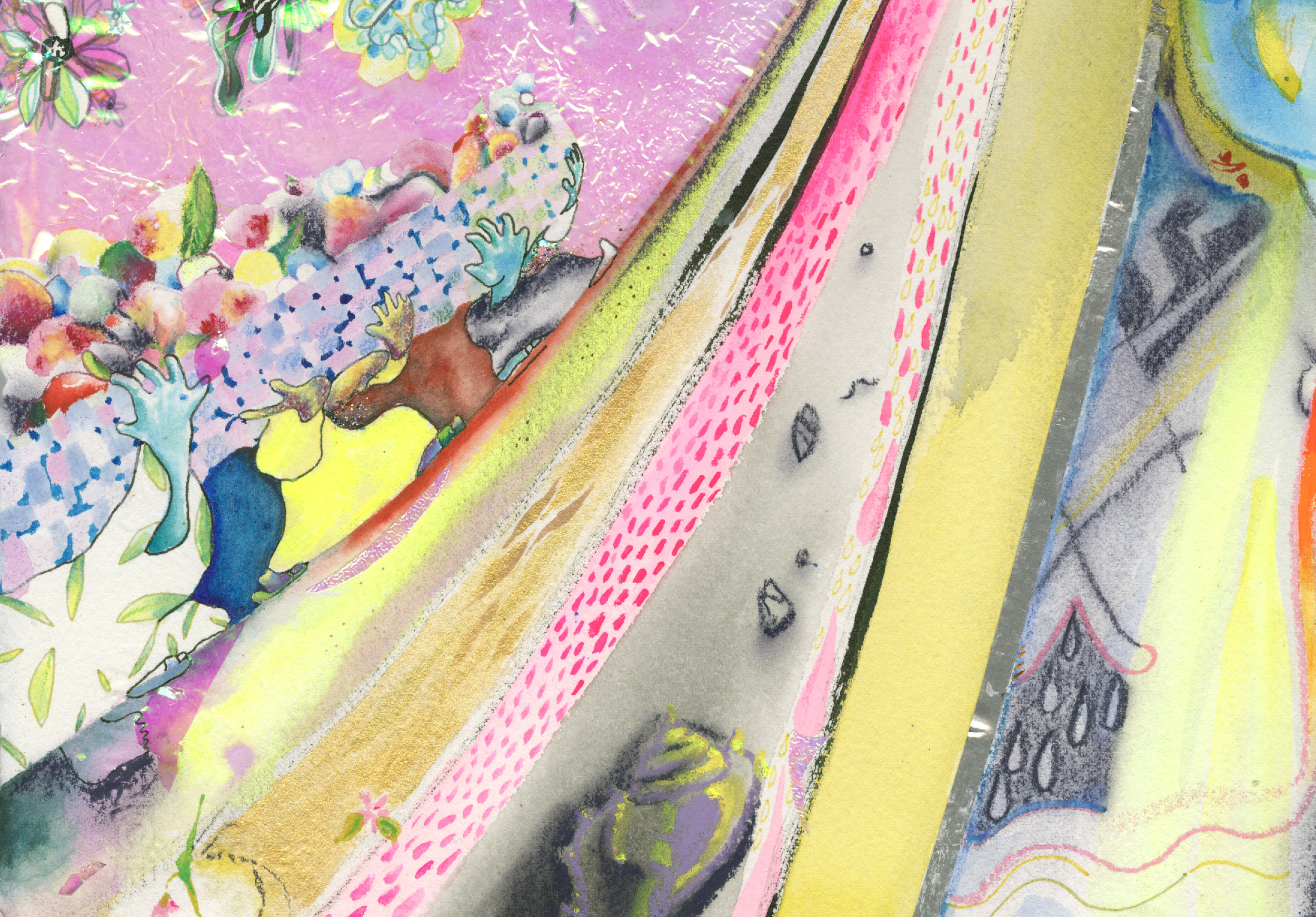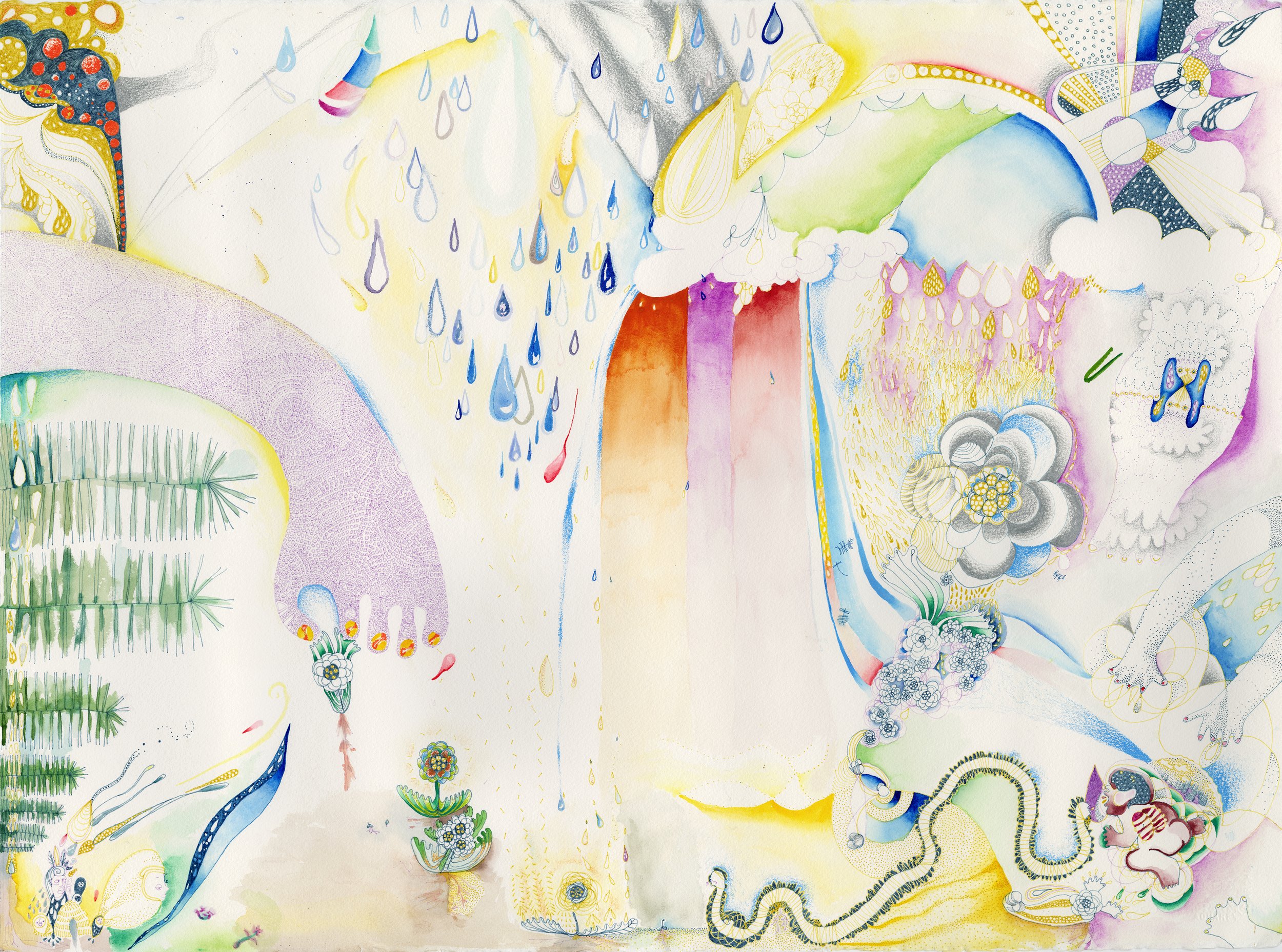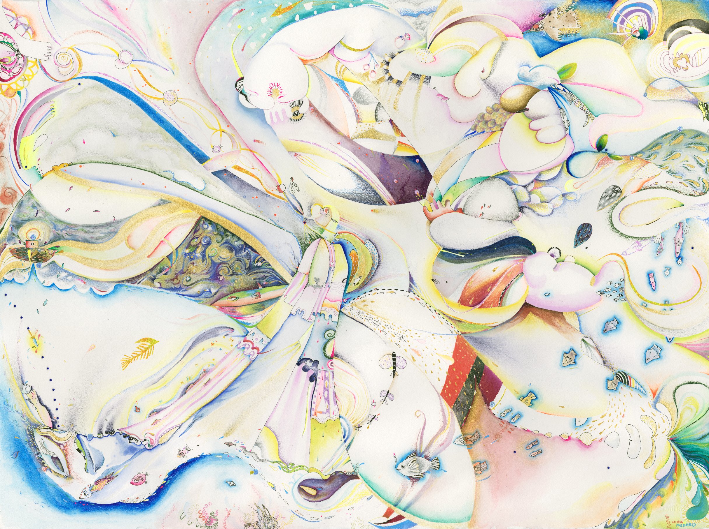 watercolor, ink, colored pencil, chalk, gouache and collaged iridescent paper on Arches