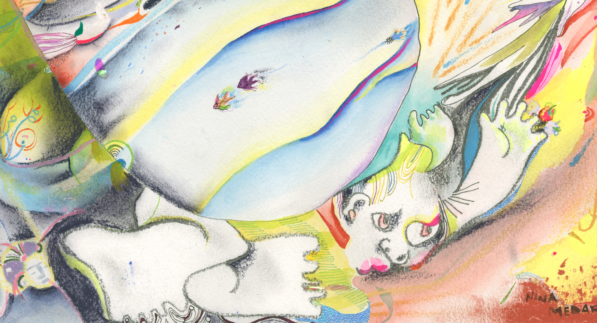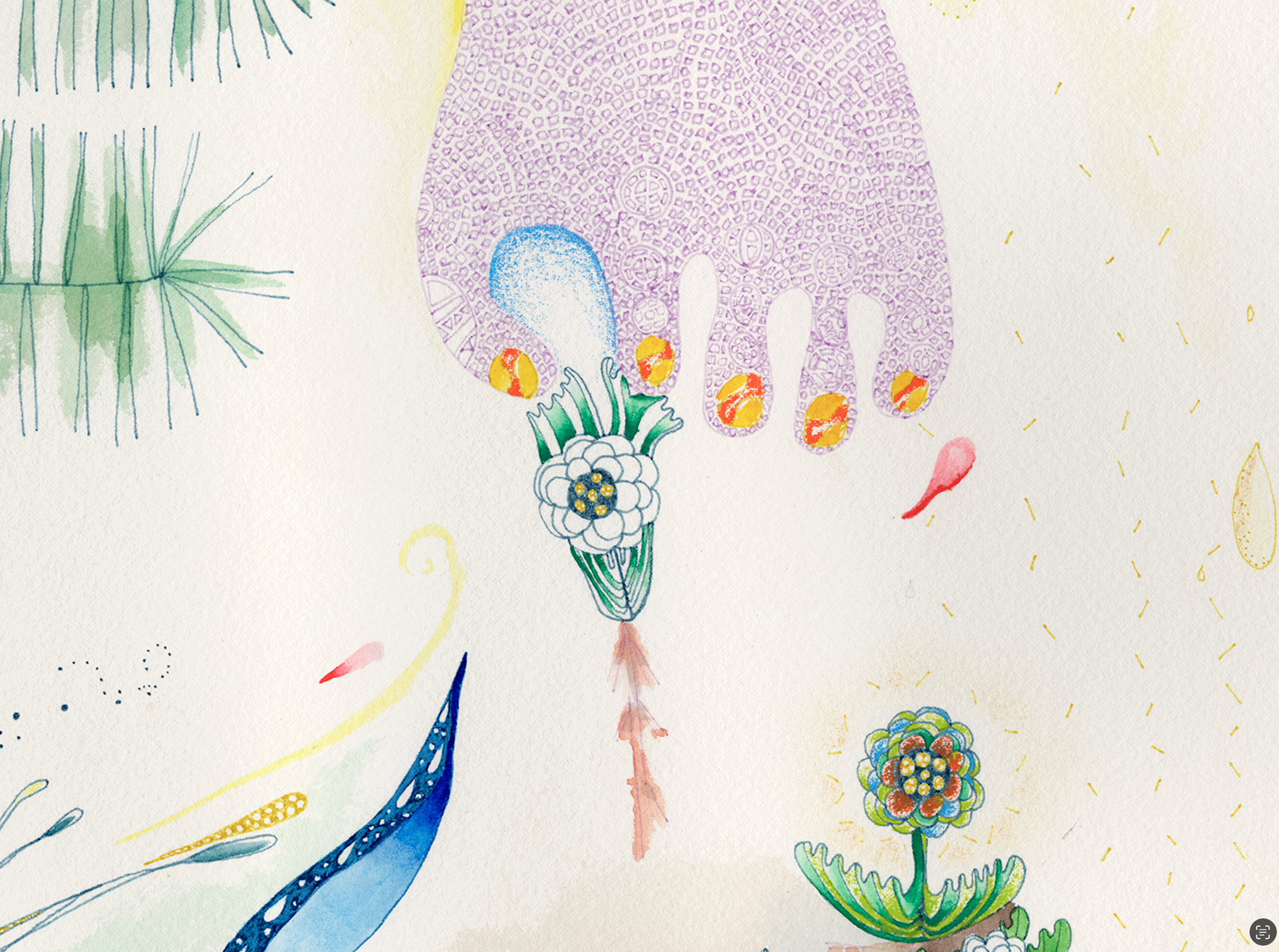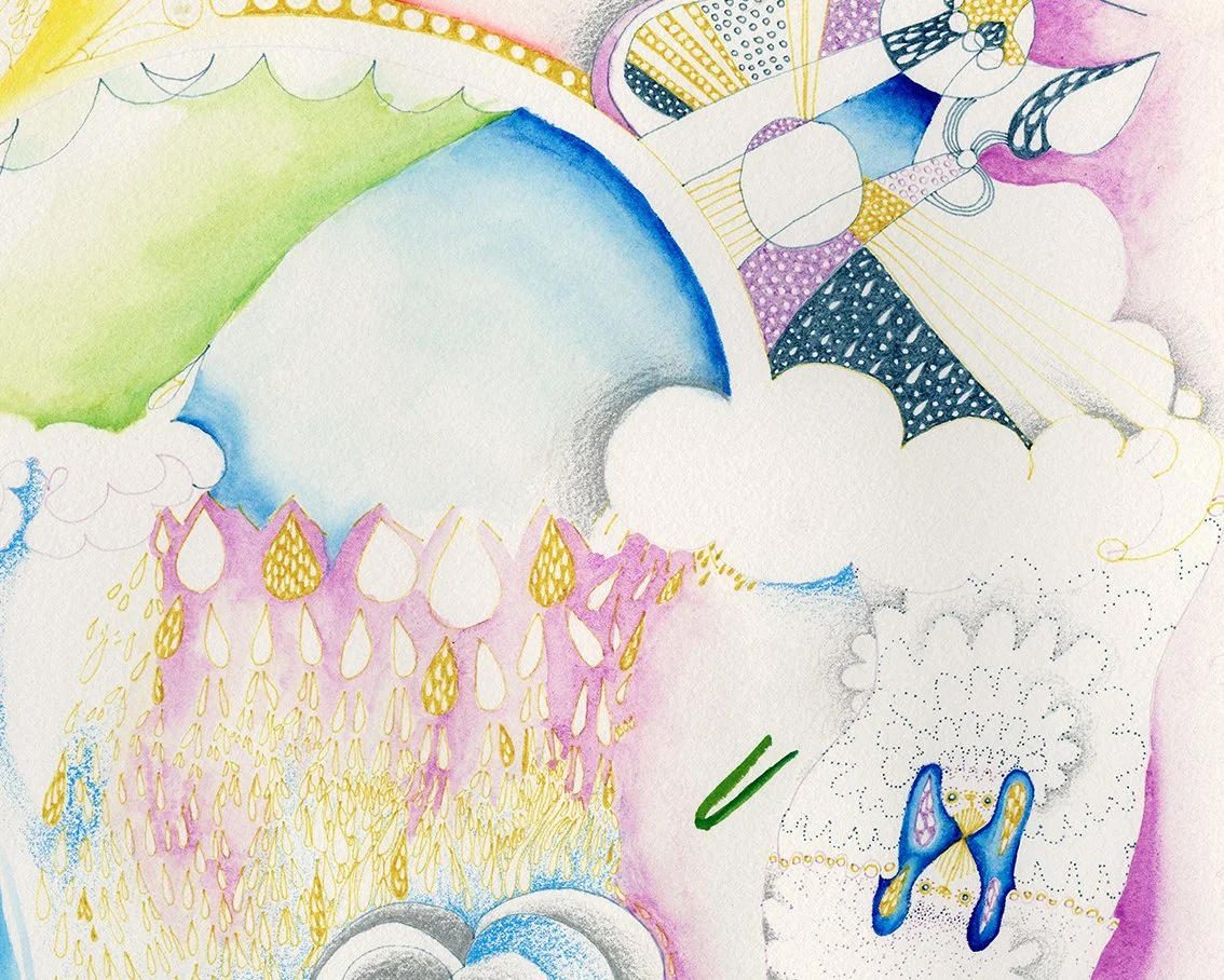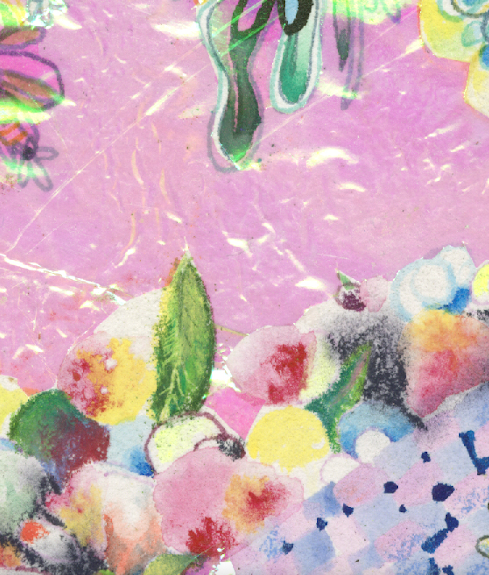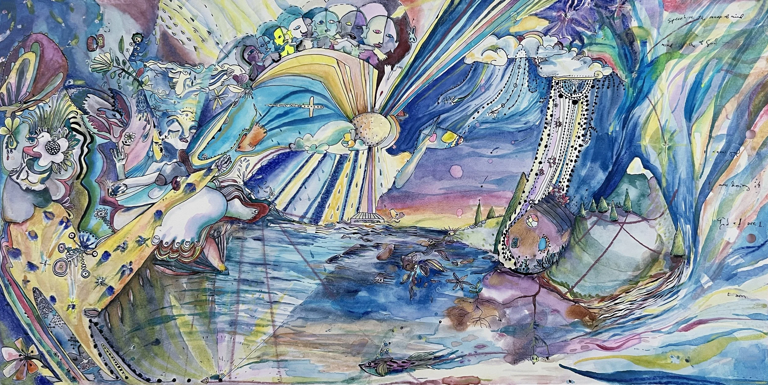 watercolor, ink, colored pencil, chalk, gouache and collaged iridescent paper on Arches