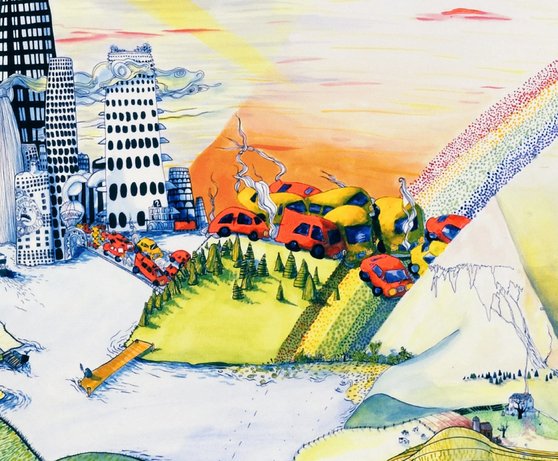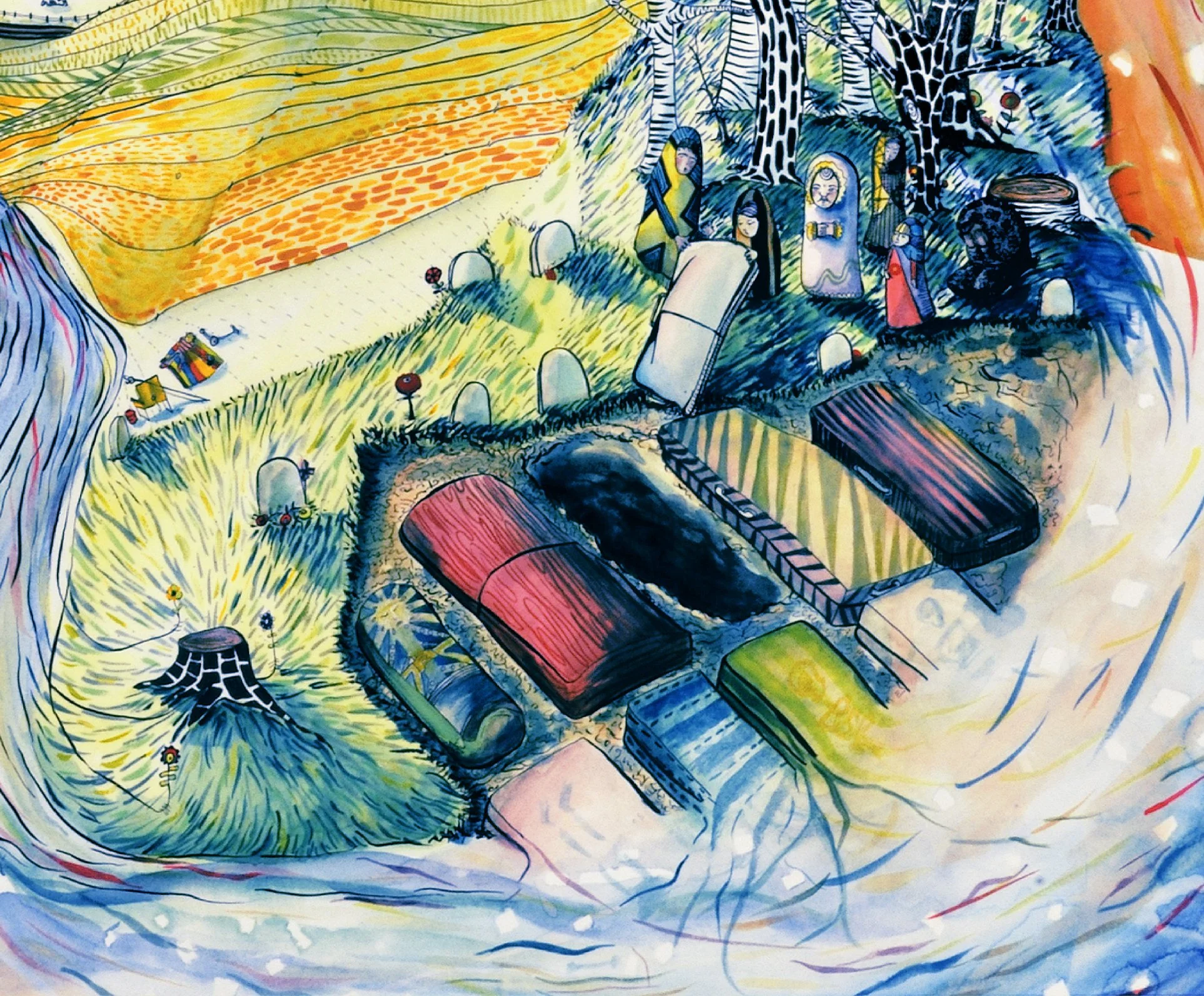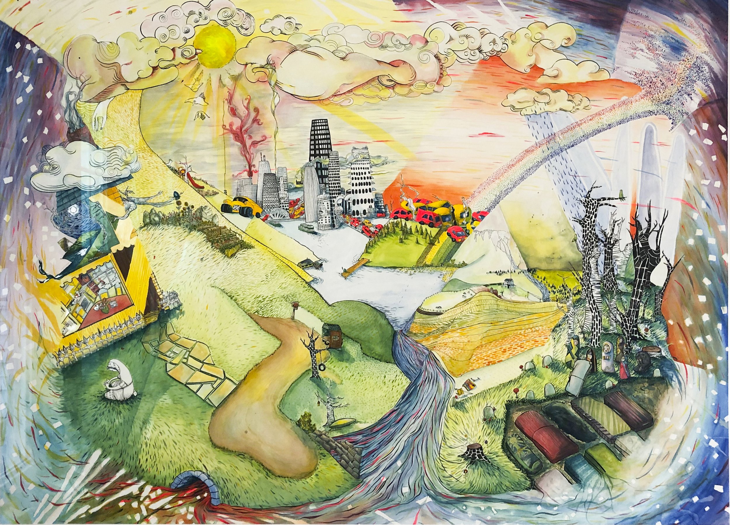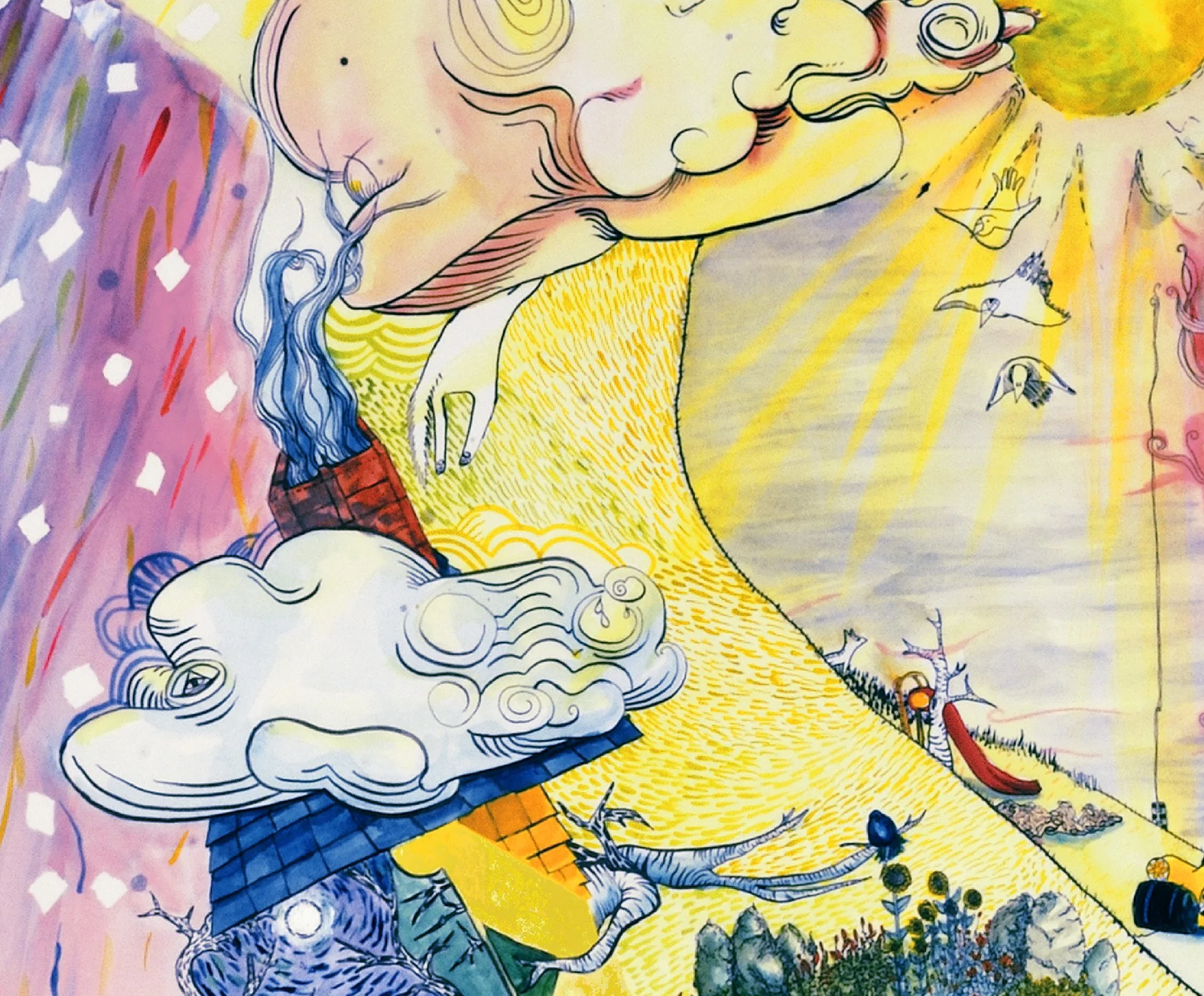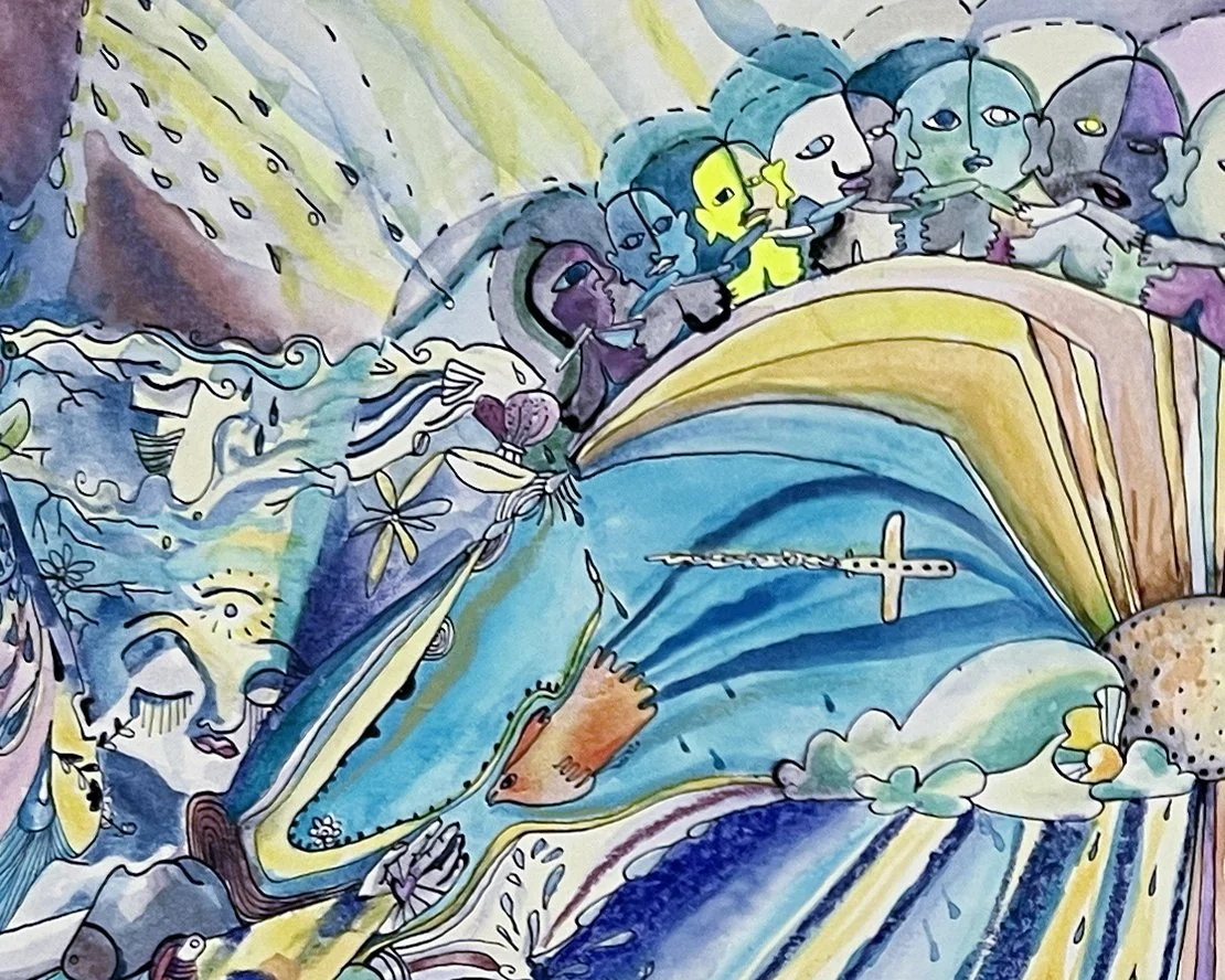 watercolor, ink, colored pencil, chalk, gouache and collaged iridescent paper on Arches
