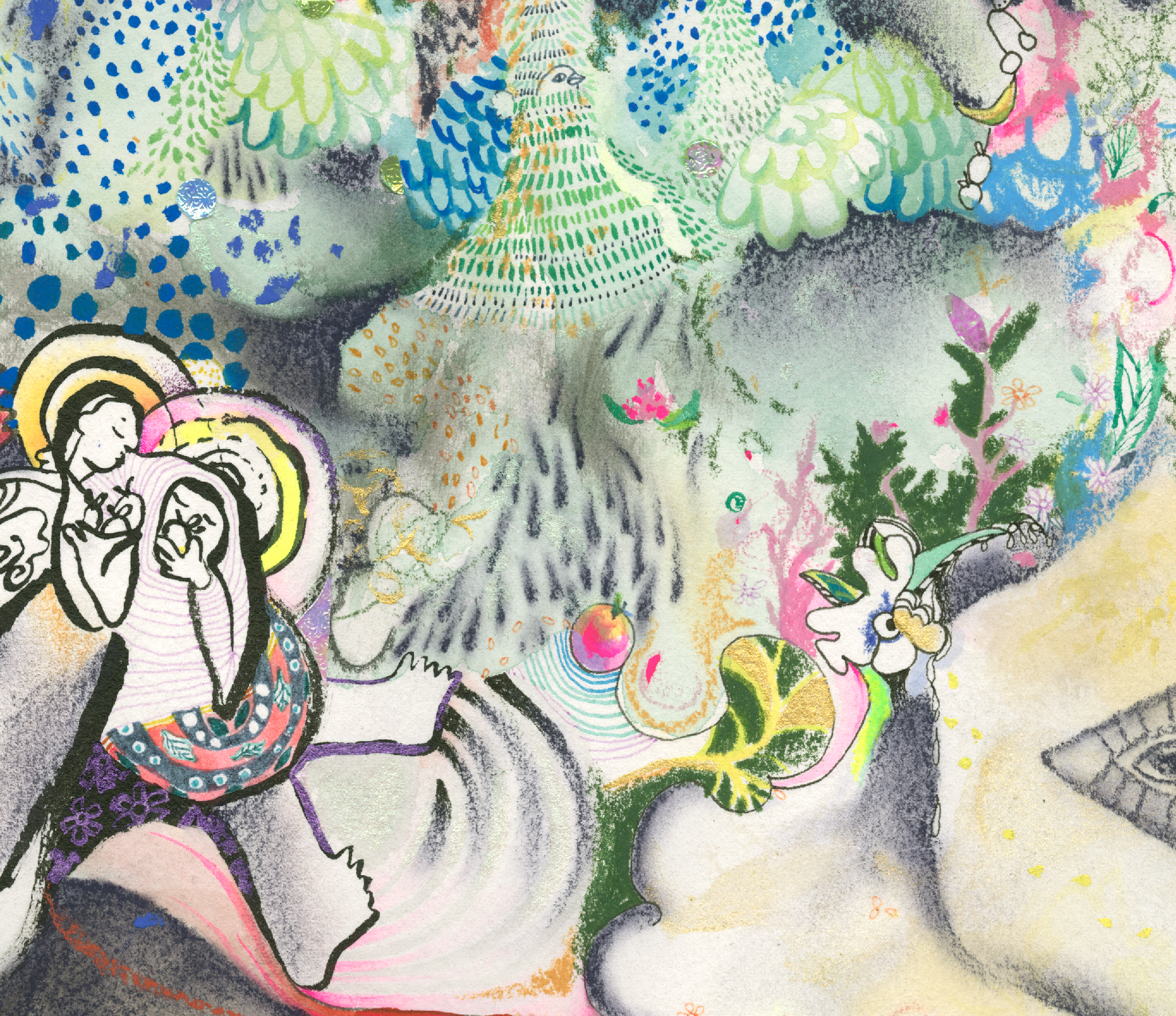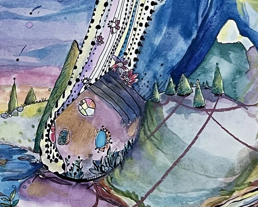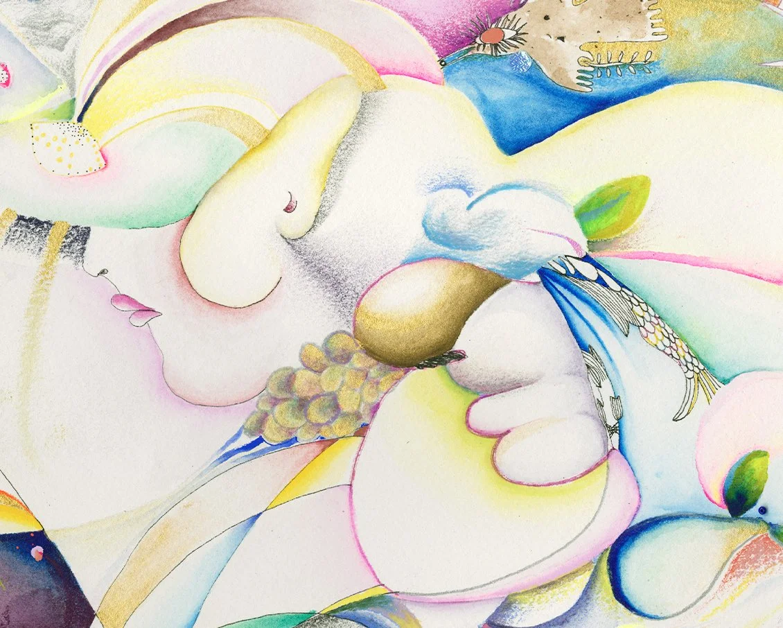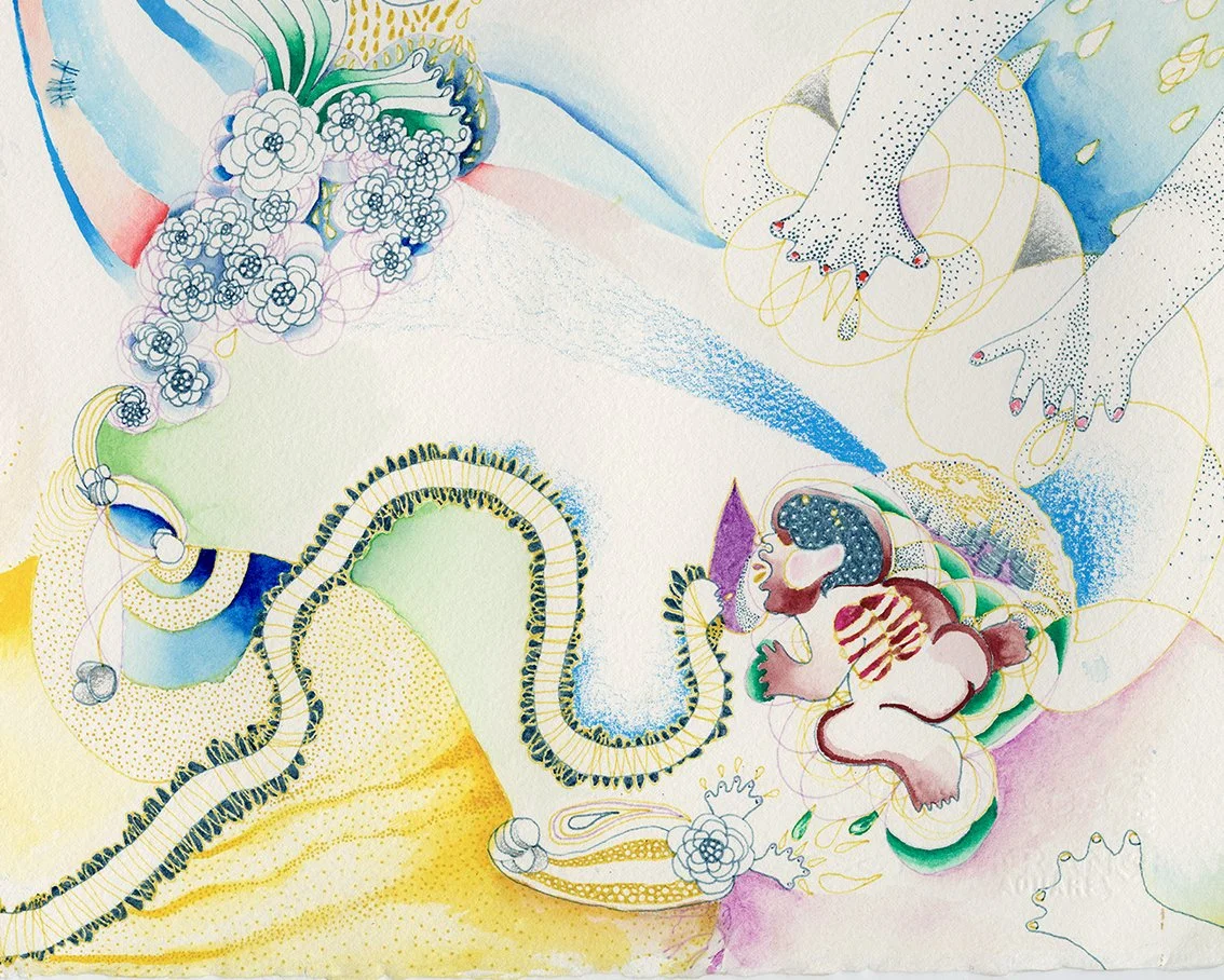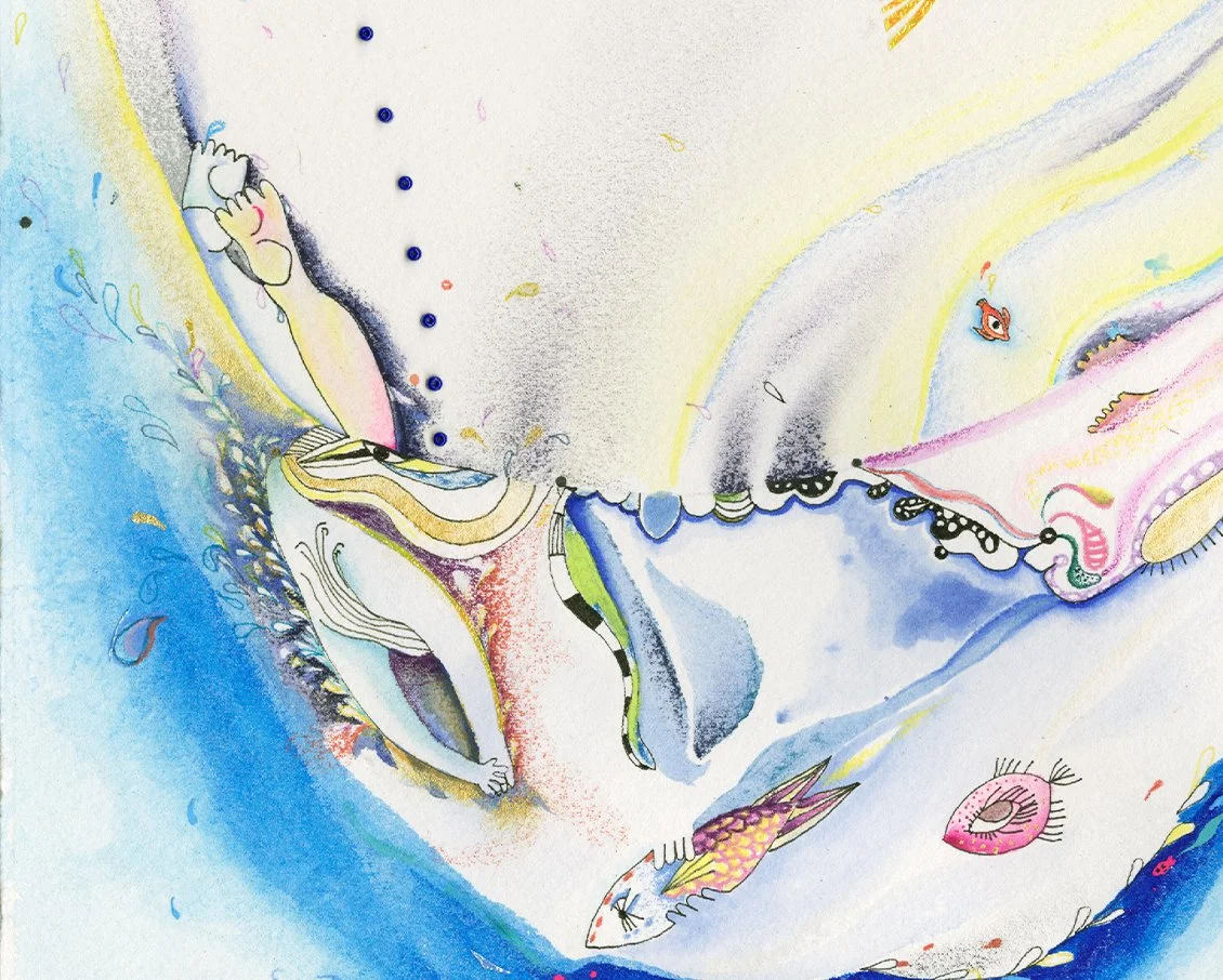 watercolor, chalk pastel, gouache, colored pencil, collaged beads and iridescent paper on Arches